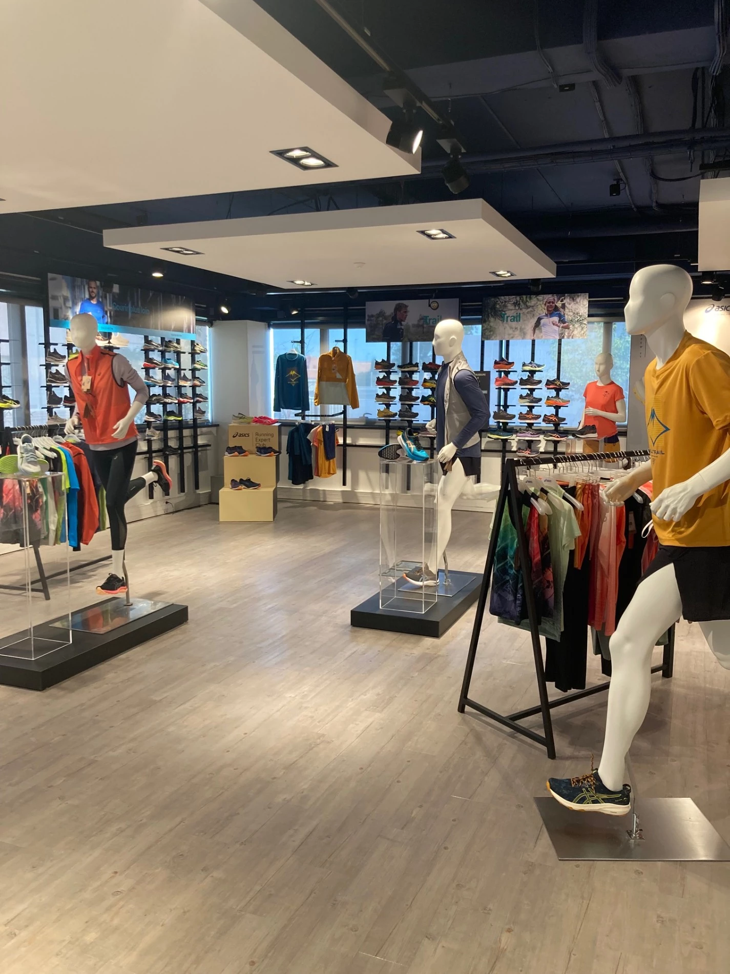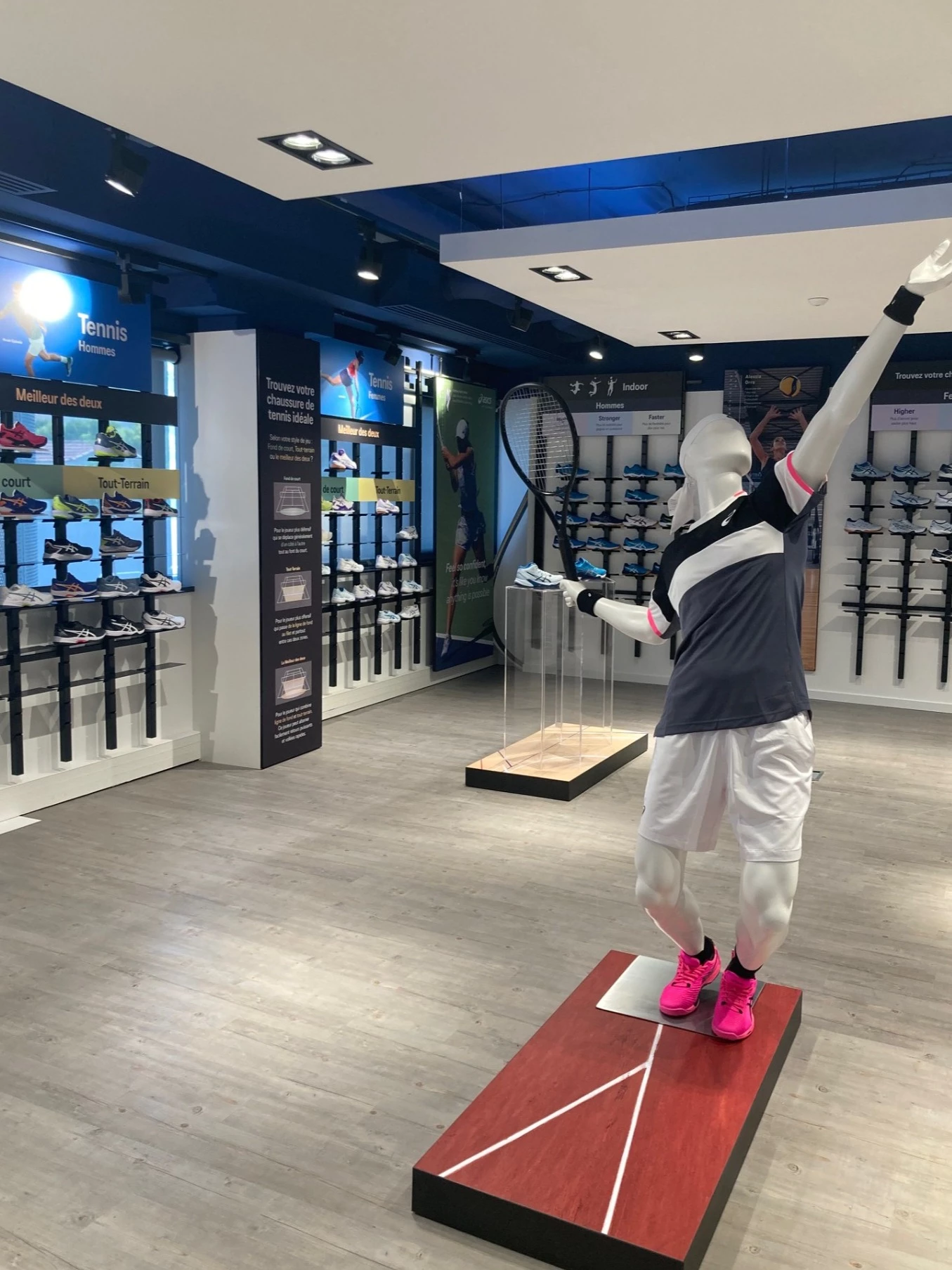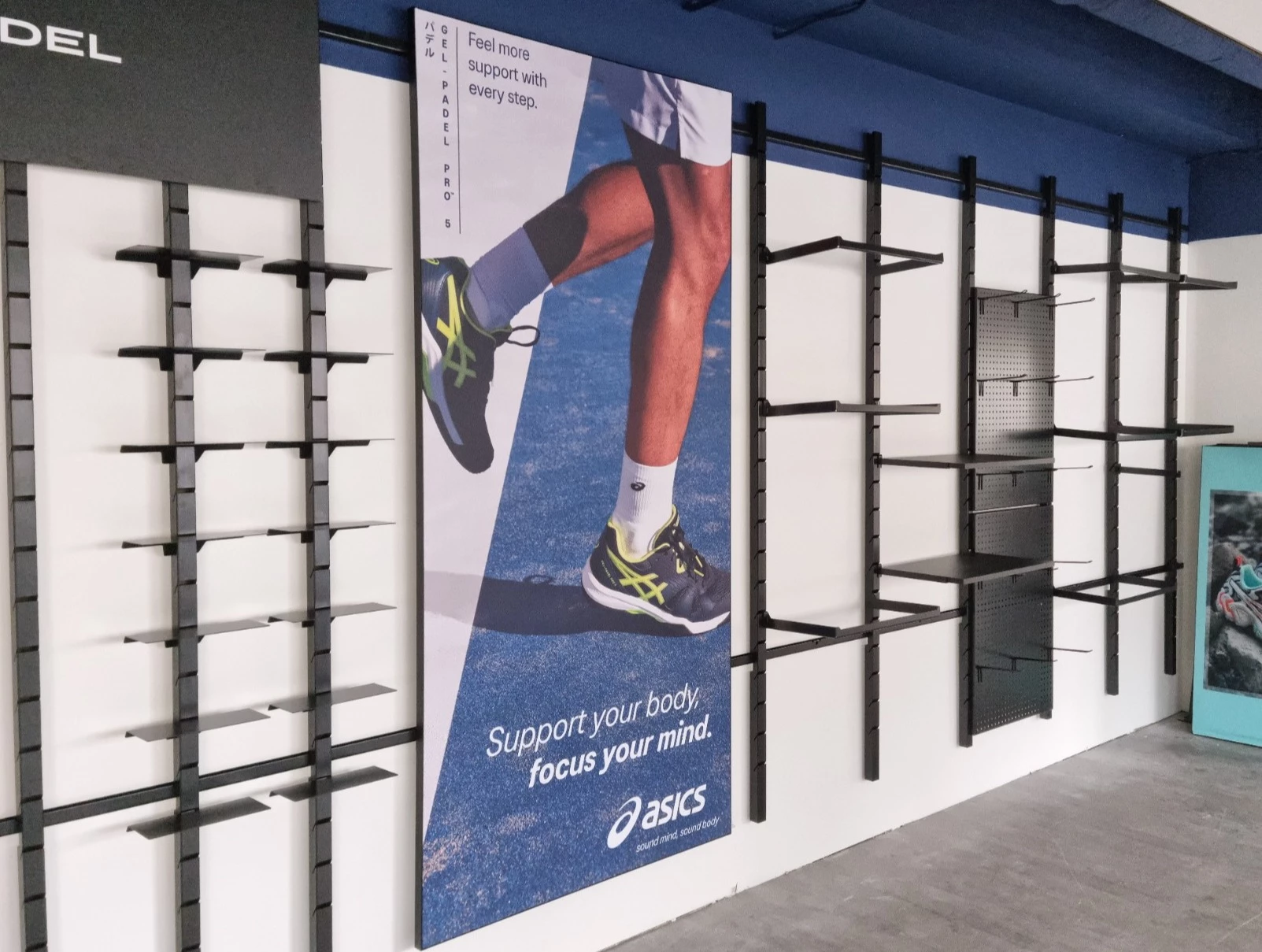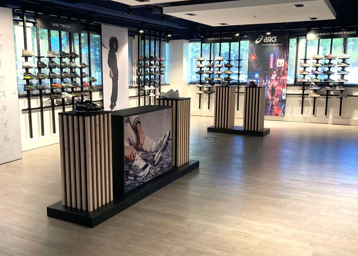 Dans la première pièce, l'ambiance se doit d'être particulière pour distinguer la marque Onitsuka Tiger du reste des segments de la marque, puis la place est faite au running-trail, pour enfin aboutir sur l'espace attribué aux sports de raquettes.